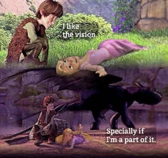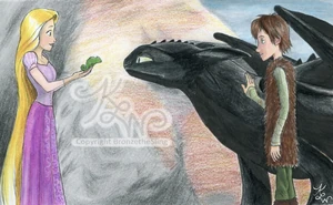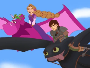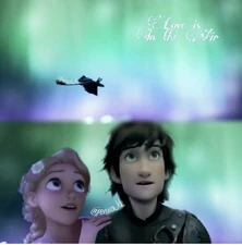 Hiccunzel is the name of the pairing between Hiccup Horrendous Haddock III from How to Train Your Dragon (2010) and Rapunzel Corona from Tangled (2010). It is not as popular as Jackunzel and Mericcup, however it does have a huge fanbase of art and fanfiction. Hiccunzel is considered to be one of the oldest crossover ships in the fandom. Both Tangled and How to Train Your Dragon came out in 2010 --two years before the Big Four was created.