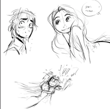Within the Big Four, Rapunzel and Hiccup have a lot of things in common. While Jack and Merida tend to be more fiery, Rapunzel and Hiccup are calmer and rely more on their intelligence than a special ability or power. Rapunzel lost her long, golden blonde hair while Hiccup lost his leg --just like Toothless lost his fin. They also appeared to be very jumpy. Hiccup is good at sketching and drawing while Rapunzel likes painting. They're both bookworms who enjoy reading for fun (along with the Tangled TV series having Rapunzel befriending and training a young dragon with help from a book on them), they are the only child of their families and got separated from their mothers when they were just babies, before reuniting with them years later. They also had troubles with their leadership role fathers, until they were able to sort out with them. As for their mothers, Hiccup and Rapunzel are shown to be very close to them, as Valka and Arianna are/were adventurous like them.
