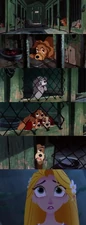 In the Jackunzel and Eugunzel pairings, Rapunzel is portrayed as Lady. As Rapunzel had lived a sheltered-like life style before she met someone who shows her the outside world, while falling in love with her trouble maker, law dogging guide. Just as her kind, brave, friendly, sweet, and caring personality could have her as Angel from Lady and the Tramp 2: Scamp's Adventure.